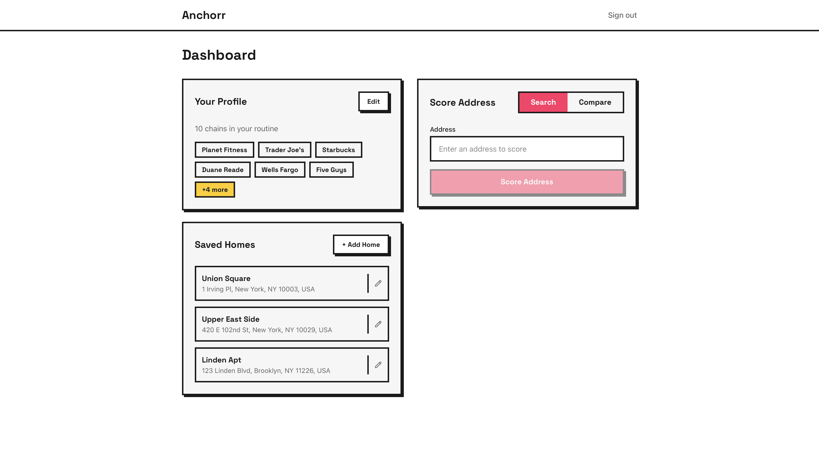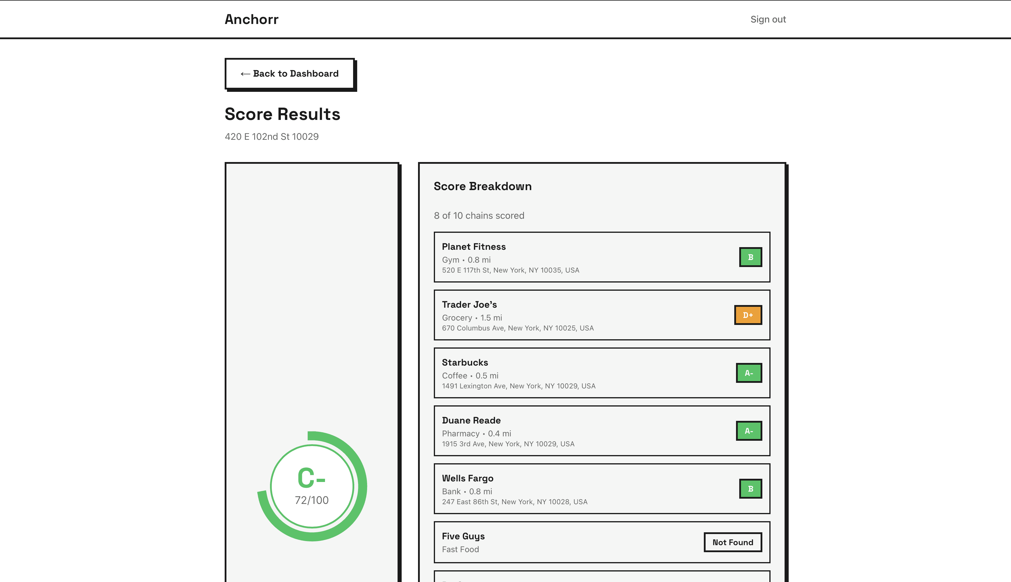 This is why I made Anchorr. It's a tool that makes it easy to determine how well-suited a place is to your daily routine. After inputting your favorite chains, Anchorr scores apartments based on how far they are from the places you frequent. Furthermore, you can compare saved locations or use Anchorr off the bat to determine where you should be looking.